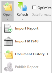 Open menu contains the import functions for different file types. It also has the list of documents used previously.
