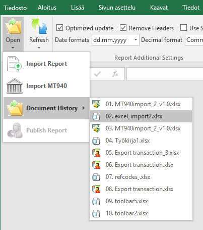 Shows the list of Excel Toolbar documents that have been used previously.