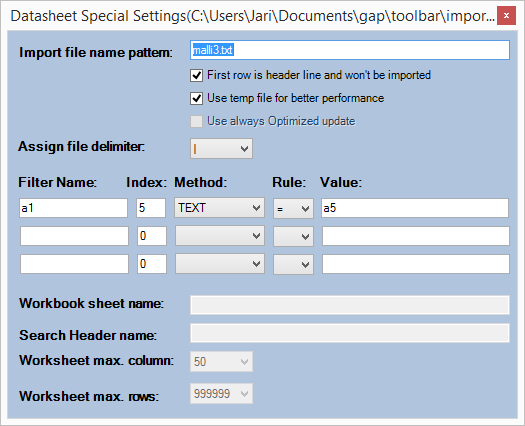 Filtering imported data may be useful if there is for example many rows in the worksheet and only some specific rows are needed. The rows can be filtered using the Datasheet special setting – dialogue shown already earlier: