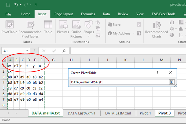 Select the area from imported data, DATA_malli4.txt in this example. Note: select the whole columns and check that there are headers written for the columns.